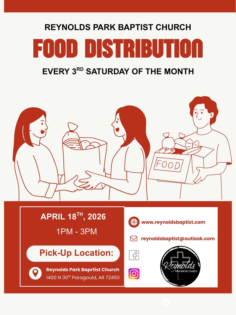 April food distribution will be on the 18th from 1pm to 3pm at Reynolds Park Baptist Church, 1400 N 30th Paragould, AR 72450. We have this every 3rd Saturday of every month!