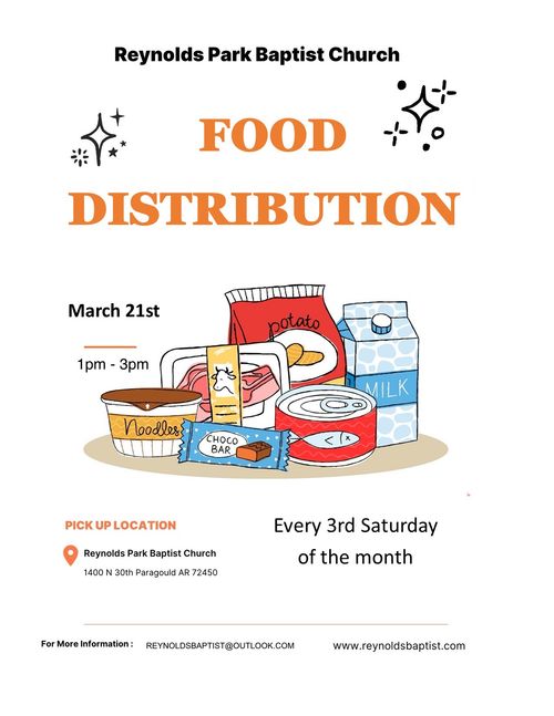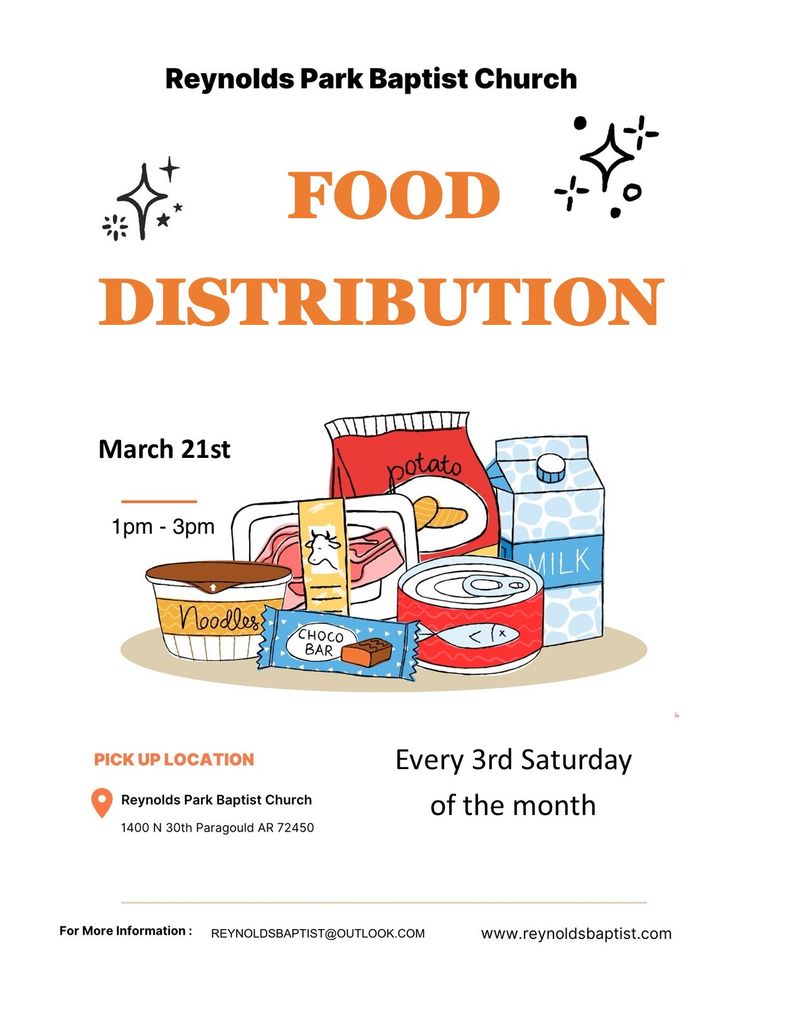March food distribution will be on the 21st from 1pm to 3pm at Reynolds Park Baptist Church, 1400 N 30th Paragould, AR 72450. We have this every 3rd Saturday of every month!